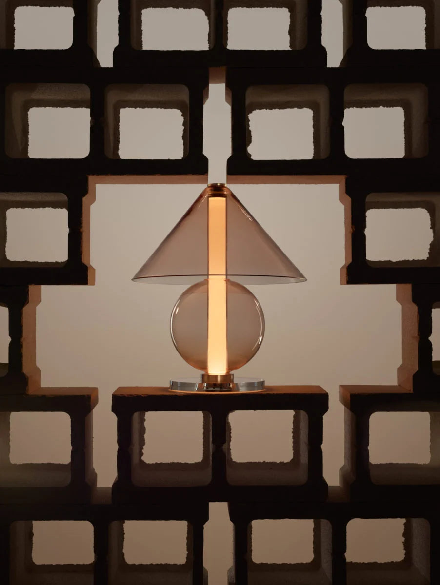 Fascinated by timeless design, designer Jaume Ramírez is interested in the archetypal table lamp in which a lampshade distributes light in all directions. This is the starting point from which he reflects and experiments to propose a new glass design, with more streamlined shapes. The Fragile lamp is a mix of geometric shapes. A cone and a sphere are arranged to hold a cylinder that emits ambient light from below.