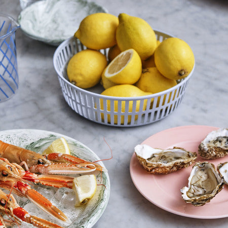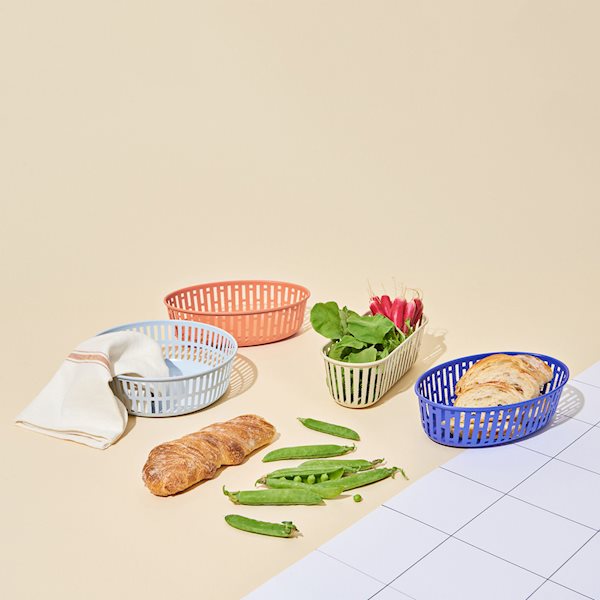 Inga Sempéの金属製バスケット シリーズは、さまざまな形状とさまざまな切り抜き部分で構成されており、それぞれに不規則なギザギザの歯が特徴で、独特の外観を生み出しています。パン用バスケットとして設計されていますが、さまざまな部屋のさまざまなアイテムを保管するのにも適しています。バスケットにはさまざまな色があり、食品に安全です。