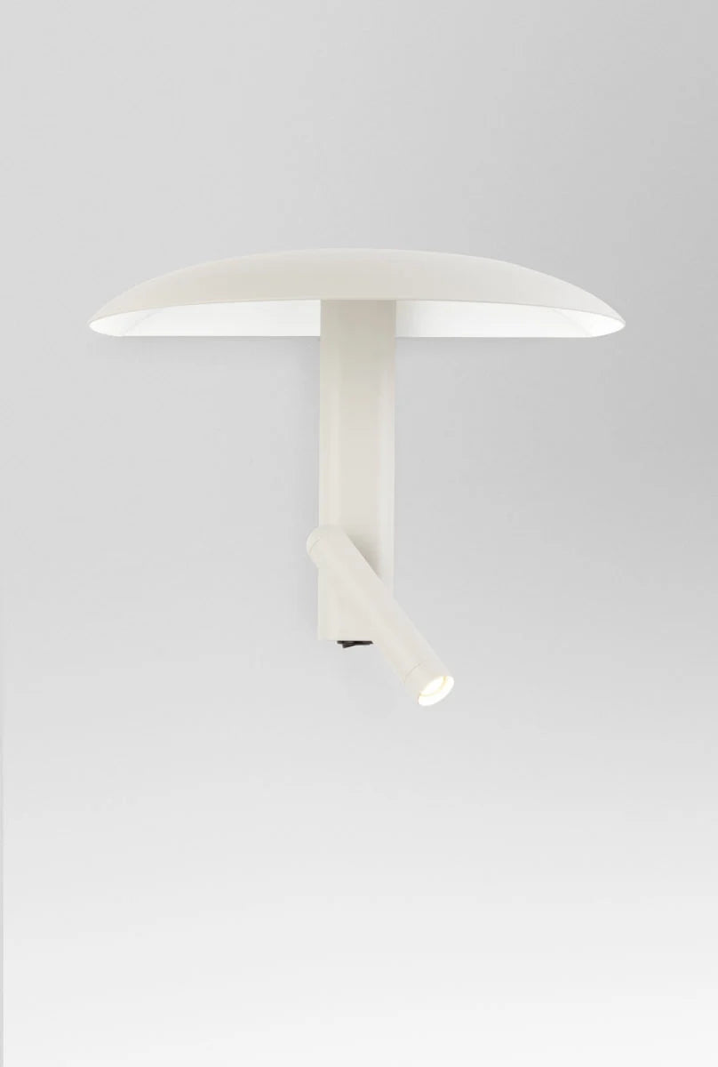 The result is a simple, discreet wall lamp with a shade over a directed spotlight that turns through 360°. The shade, like a hat, covers the spotlight, allowing the light to be directed upwards, bounce off the inside and project a beam of soft light, creating warm ambient lighting. If instead the spotlight is focused downwards, it projects a beam of direct light, turning the fixture into a reading lamp. The Konoha design is available in a range of colours, with neutral and organic shades that fit seamlessly into any space. It can be used as a reading lamp in waiting rooms, bedrooms or hotels. Or it can be a point of light in walkways, a wall lamp in restaurants or a way to bring ambient lighting to hotel entrances.