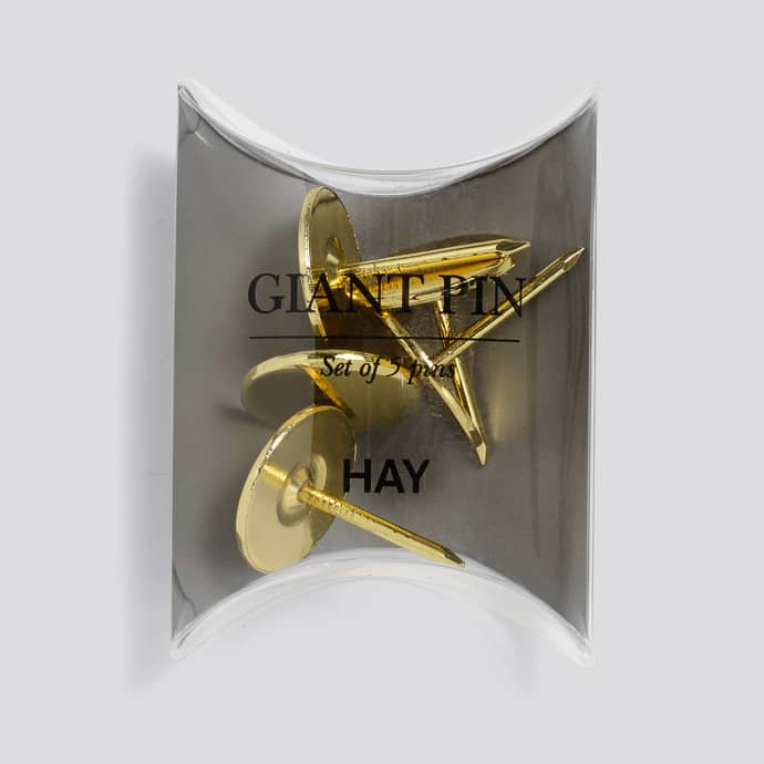 헤이 자이언트 핀(Hay Giant Pin)은 대형 드로잉 핀입니다. 강한 철로 제작되었으며 반짝이는 금색 마감 처리가 되어 있으며 고정하거나 게시하기 쉽도록 끝 부분이 매우 큽니다.