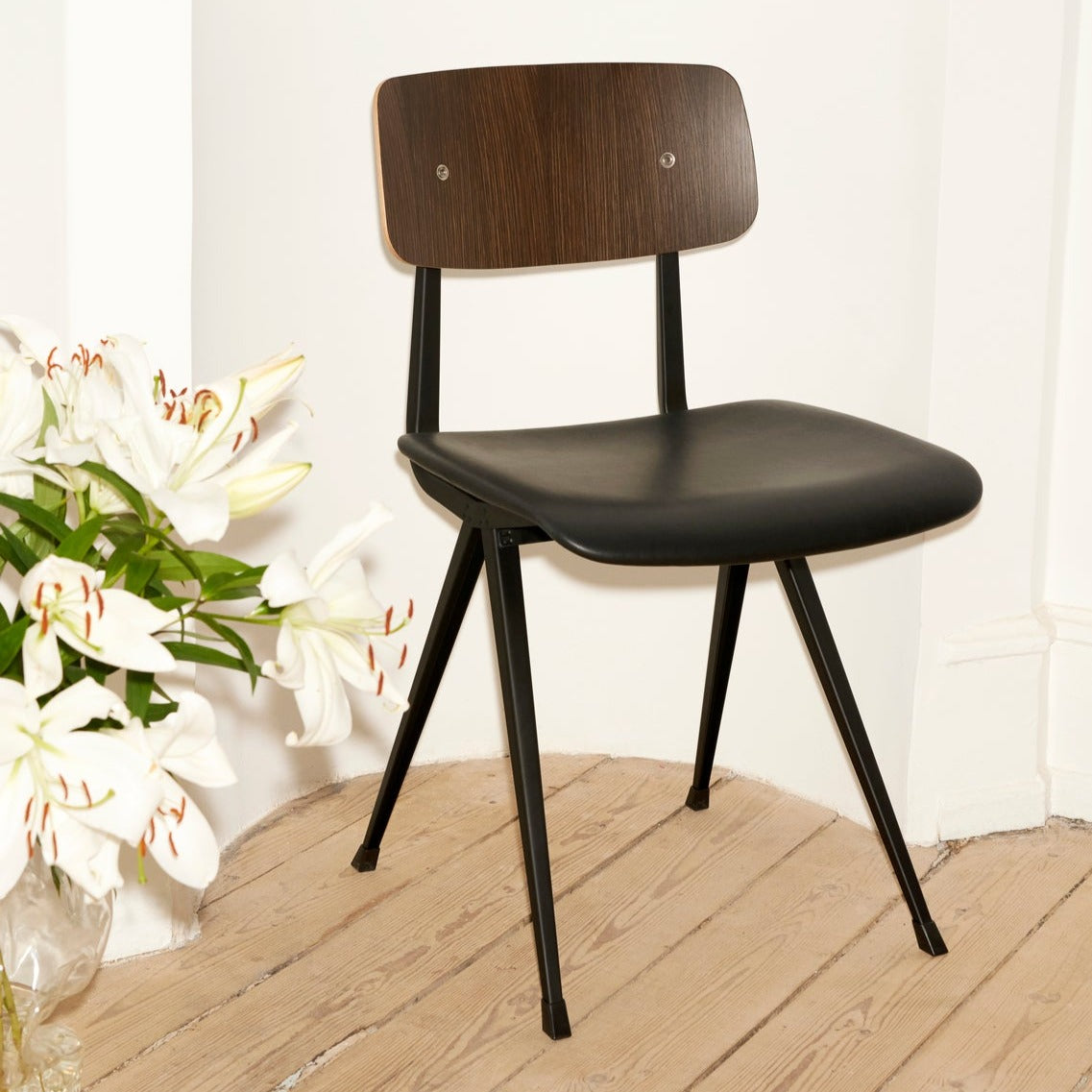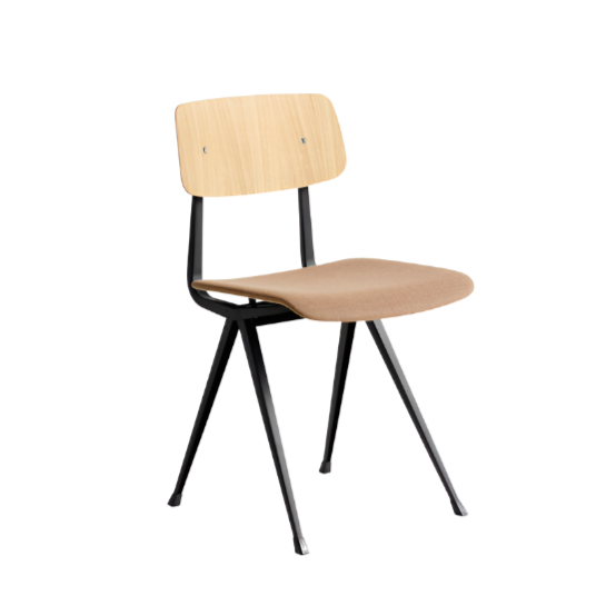 성형합판 시트와 등받이. 참나무 상판 베니어. 강철판 다리. 표준 글라이더 포함.
