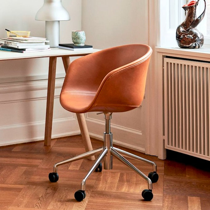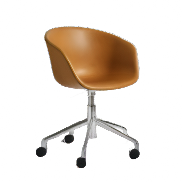 Injection moulded polypropylene shell with armrest with full upholstery with 10 mm foam. 5 star swivel base in cast aluminum with gas lift, and soft wheels for all floors. All black and polished bases have black wheels. All white bases have white wheels with grey rubber.