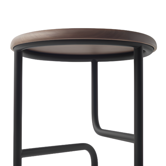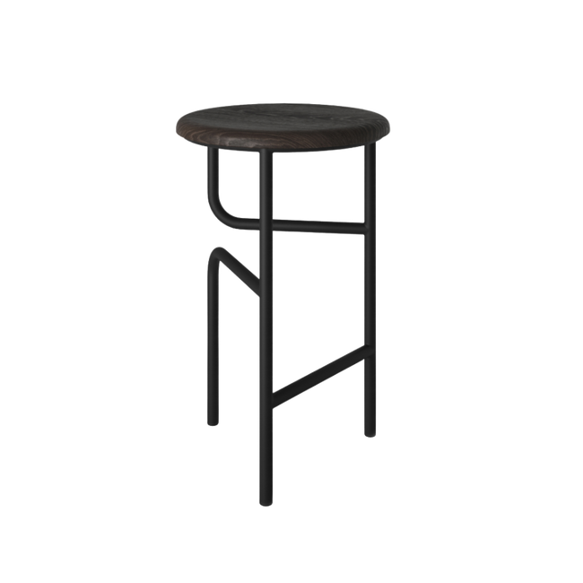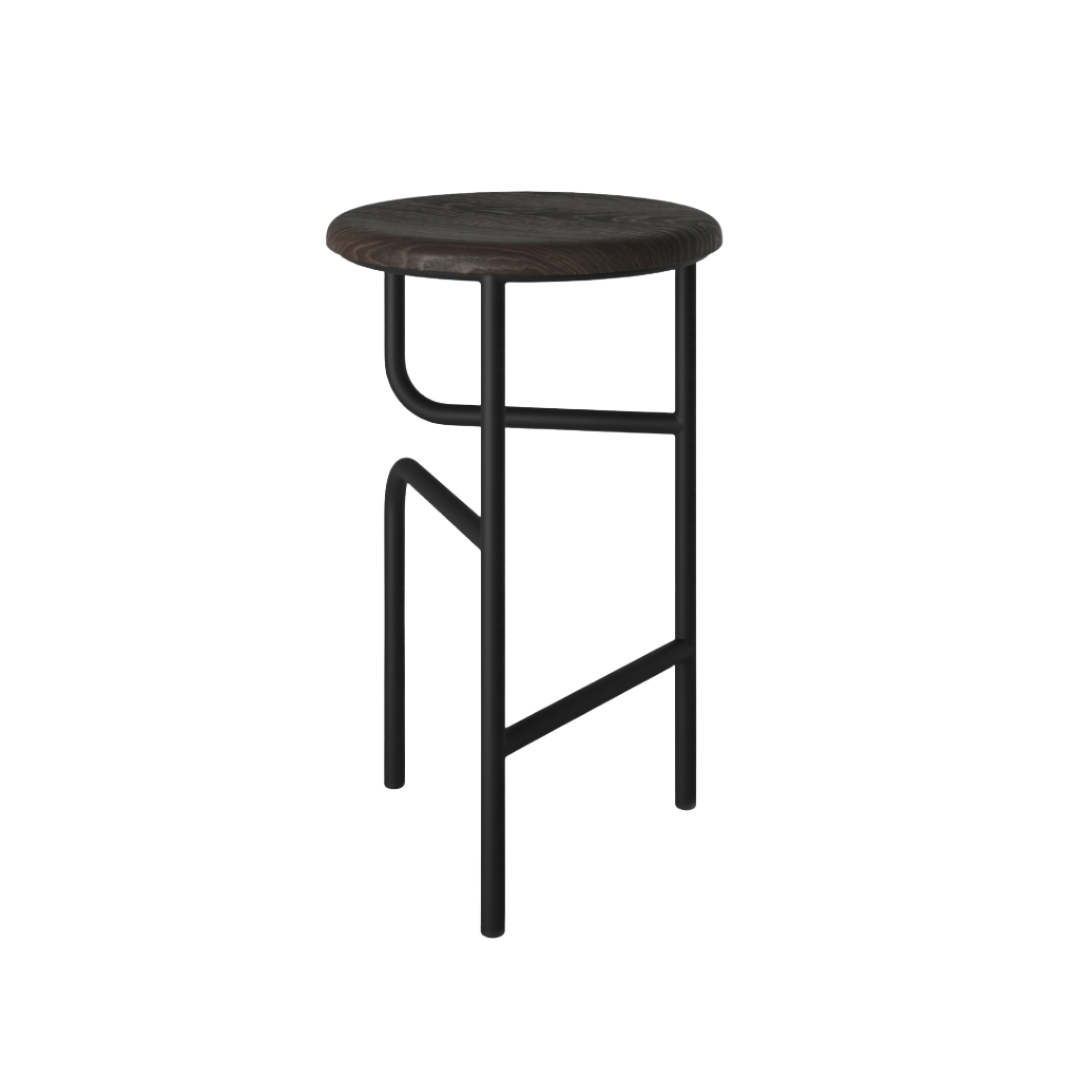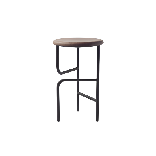 A three-legged bar stool with three crossbars was the base design, but as two of the crossbars melt away in the middle, the bars, initially tasked with horizontally connecting the legs, instead turn perpendicular to support the seat and a leg. A lone crossbar remains, acting as a footrest.