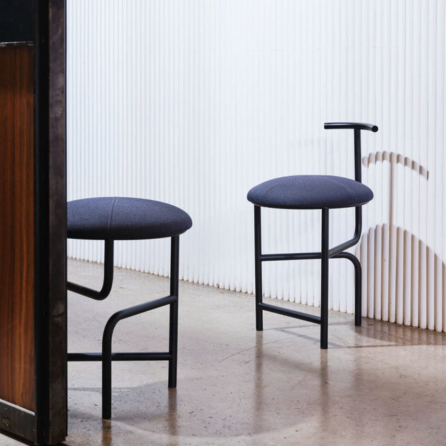This slight structural change utterly transforms the direction of force and how it is applied, becoming the stool’s major feature. 5 variations are available, including short stools, those with a leg seemingly extended up into a backrest, and those with upholstered seats.