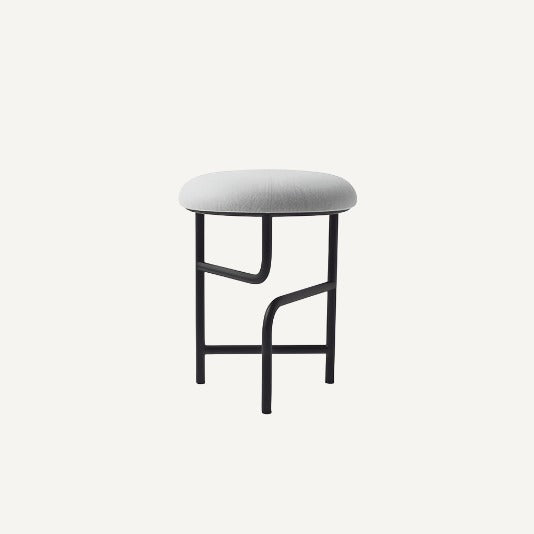 A three-legged bar stool with three crossbars was the base design, but as two of the crossbars melt away in the middle, the bars, initially tasked with horizontally connecting the legs, instead turn perpendicular to support the seat and a leg. A lone crossbar remains, acting as a footrest.