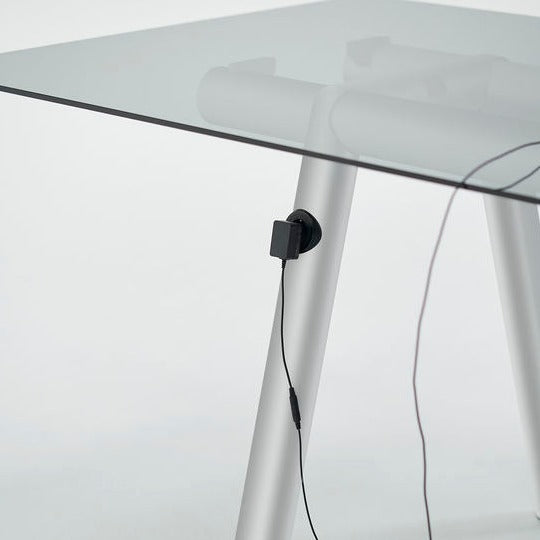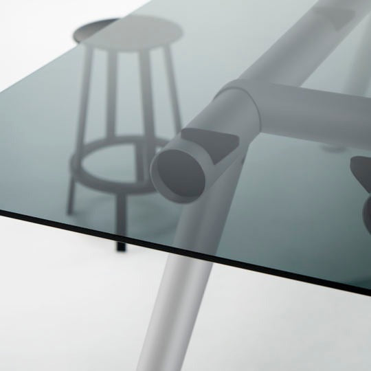 mm tempered glass tabletop mounted with glass bumpers. Ø100 mm aluminium tube