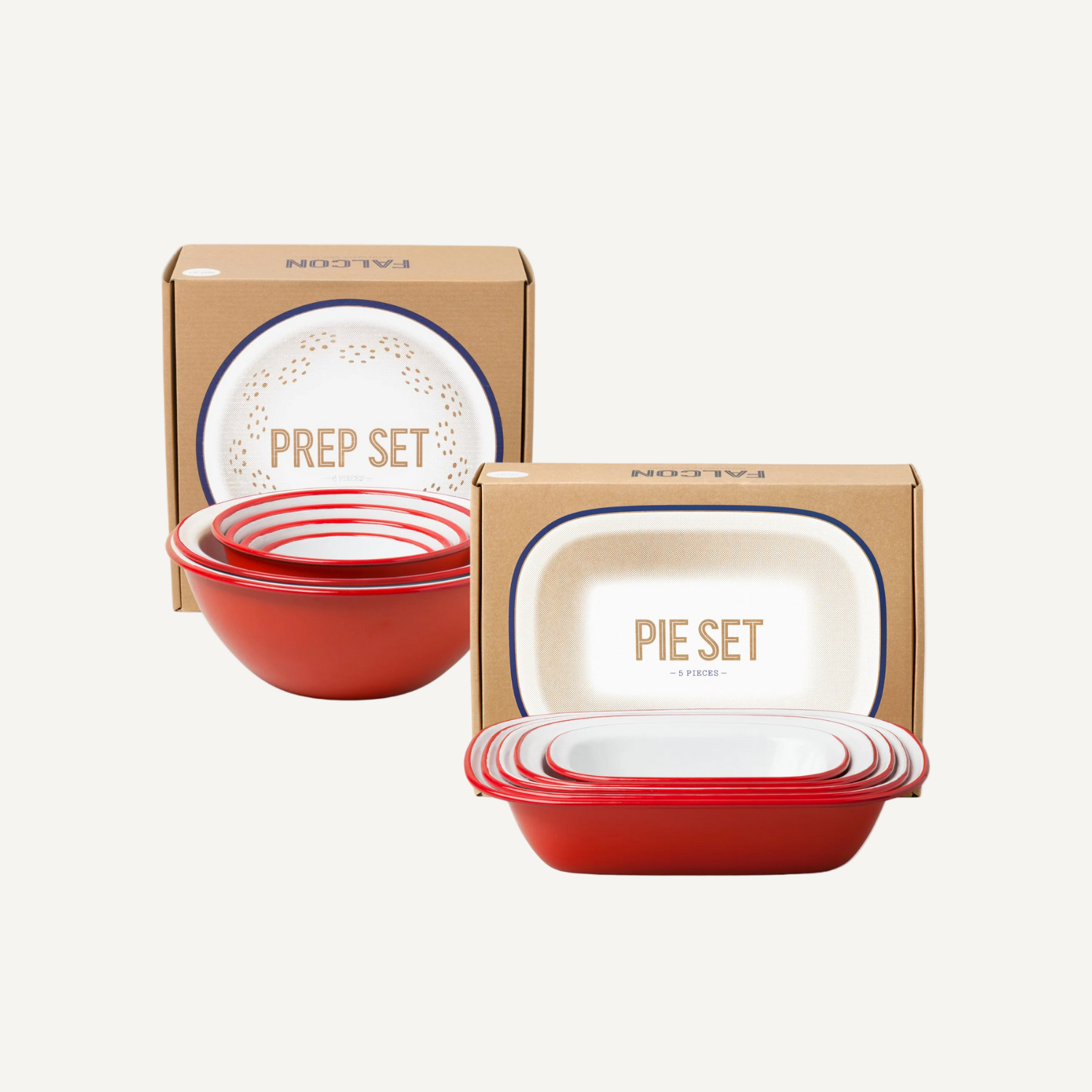 A five-piece pie set, the original and most iconic Falcon product. Feed the whole family with a giant pie or serve up solo portions. A six-piece bowl and colander set, with a bowl big enough to make a cake right down to small dishes for nibbles.