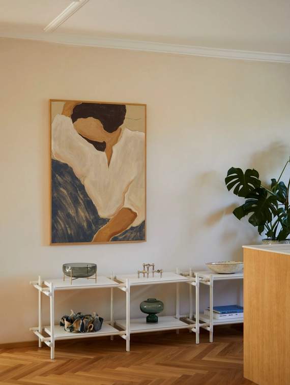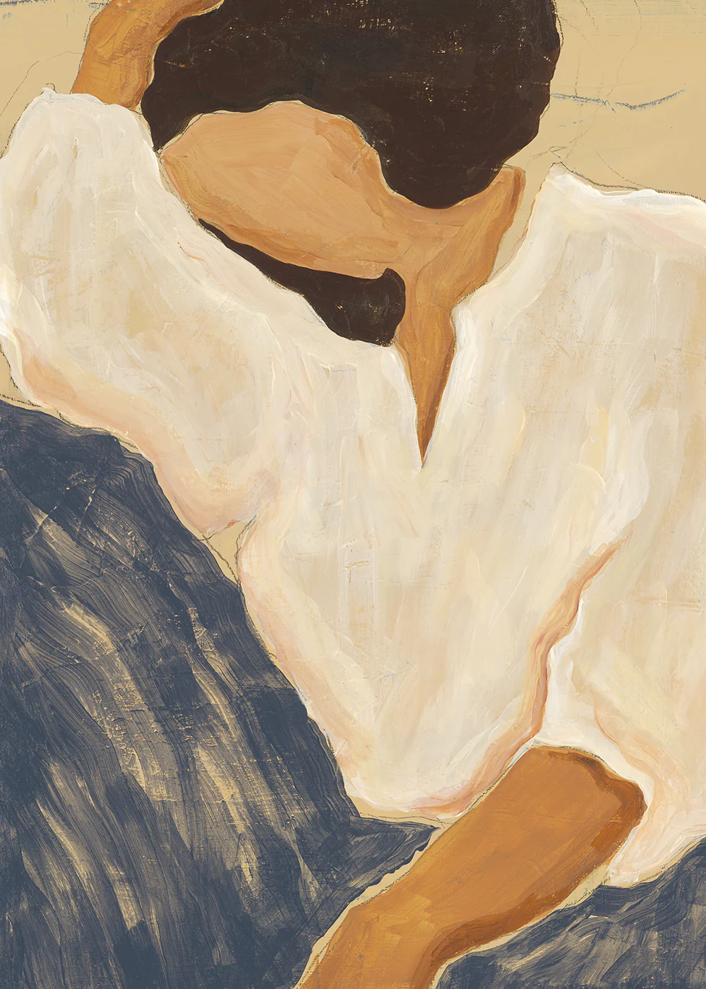 Soft, billowing clothing and a relaxed character form the center of Silent Dreams by French artistic duo Sacrée Frangine. Exploring the beauty of quiet everyday situations, this motif presents an understated approach to form and subject – soft strokes of paint in blue, white and brown bring together the composition. A sense of calm is created within an art print that contains the expressive and tactile qualities of paint on canvas.