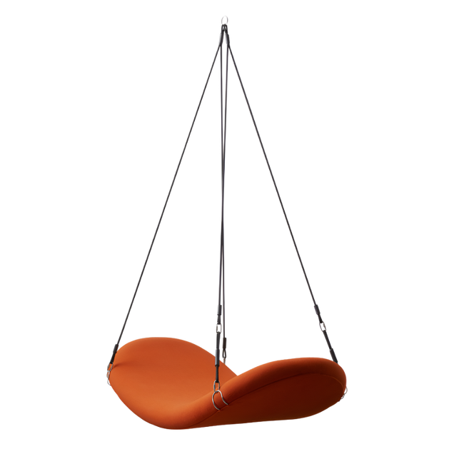 The fully upholstered Flying Chair is suspended from the ceiling on both sides using nylon ropes, making it possible to adjust the height and seating position. The eccentric design allows one to create various situational and mood-evoking environments and create unique experiences on several levels.