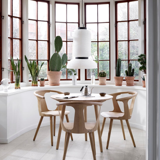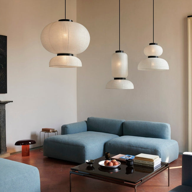 East meets West in Jaime Hayon’s playful tweak of a traditional Asian lantern in contemporary expression. Dating back centuries, paper lanterns have featured in Asia amongst the privileged and the poor, where different colours, shapes and sizes connote different meanings. Here Hayon has dispensed with cultural formalities to create a series of lamps all in white. Hand crafted with rice paper merging various sizes and shapes together. The series is comprised of three different lantern versions and a table lamp in ivory white rice paper with black stained oak accents.