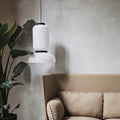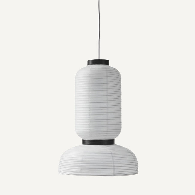 Handmade rice paper pendant. Ivory white paper, black stained oak, 4 meter black fabric cord.