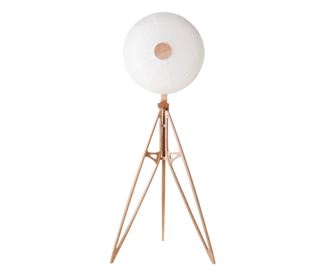 This series of floor lamps in solid walnut or ash is a tribute to both the historic woodcraft of Kyoto and the early years of Japanese aviation. The lamps’ structure invokes the intricacy of Japanese toy aeroplanes – in particular the Yoshida Hishou, an A-shaped plane fitted with two reverse propellers that successfully crossed Tokyo’s Sumida River in a 1911 model-aircraft contest.