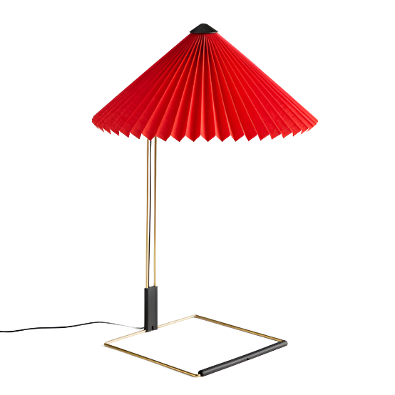 The Matin table lamp by Inga Sempé offers a contemporary yet poetic design, with a construction that combines visual delicacy with physical robustness. It consists of a steel wire bent frame finished in polished brass with matte black hardware, and is paired with a pleated cotton shade in a variety of vibrant colours. The light source is an integrated LED, offering a diffused downlight which is accompanied by a digital in-line dimmer control to adjust the output of light if required.