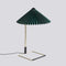 The Matin table lamp by Inga Sempé offers a contemporary yet poetic design, with a construction that combines visual delicacy with physical robustness. It consists of a steel wire bent frame finished in polished brass with matte black hardware, and is paired with a pleated cotton shade in a variety of vibrant colours. The light source is an integrated LED, offering a diffused downlight which is accompanied by a digital in-line dimmer control to adjust the output of light if required.