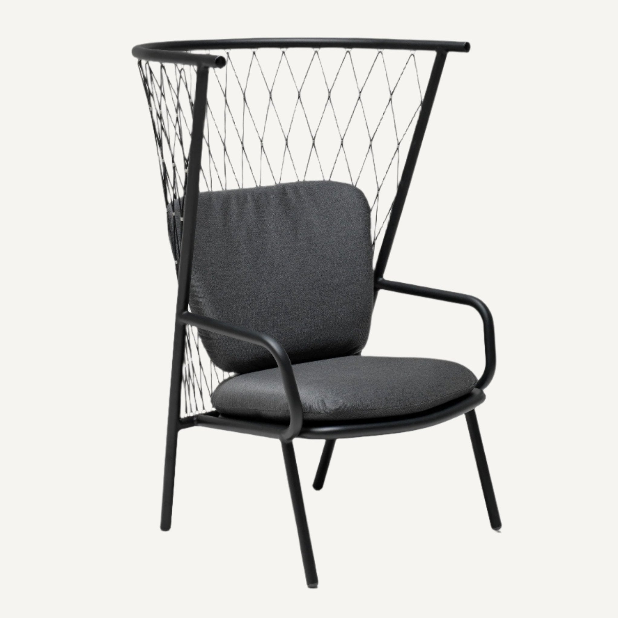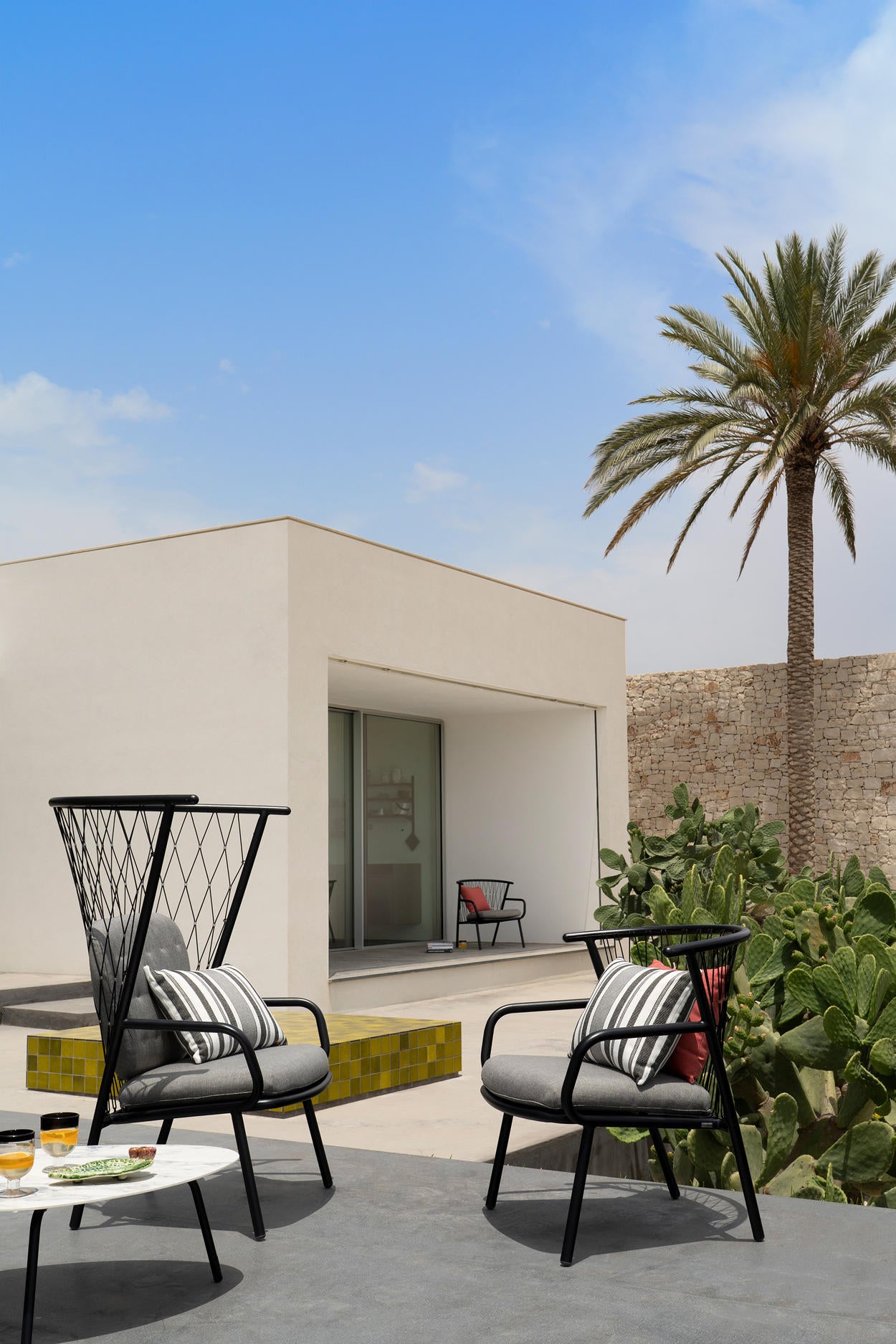 The Nef aluminium seat collection combines eclectic style and visual lightness with a solid structure, inspired by the graphic design of hot air balloons. The interweaving of polyester cords gives a natural feeling of comfort and ease to the armchair and relax chair.