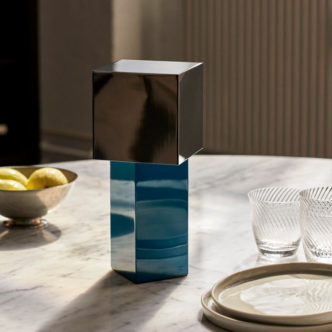 At the heart of Pivot’s design is the interplay between natural and manmade light. The lamp’s geometric shade is positioned at a 45-degree angle to the base, creating a soft diffusion that emulates the warm glow of a modern-day candle. The result is a beautiful light that exudes an inviting ambiance, transforming the mood of a milieu at the touch of a button.