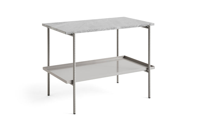 18 mm polished marble tabletop with chamfered edges or 2 mm powder coated steel traytop. 16 mm anchor rebar fully welded frame.