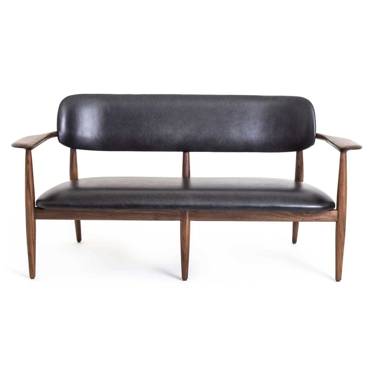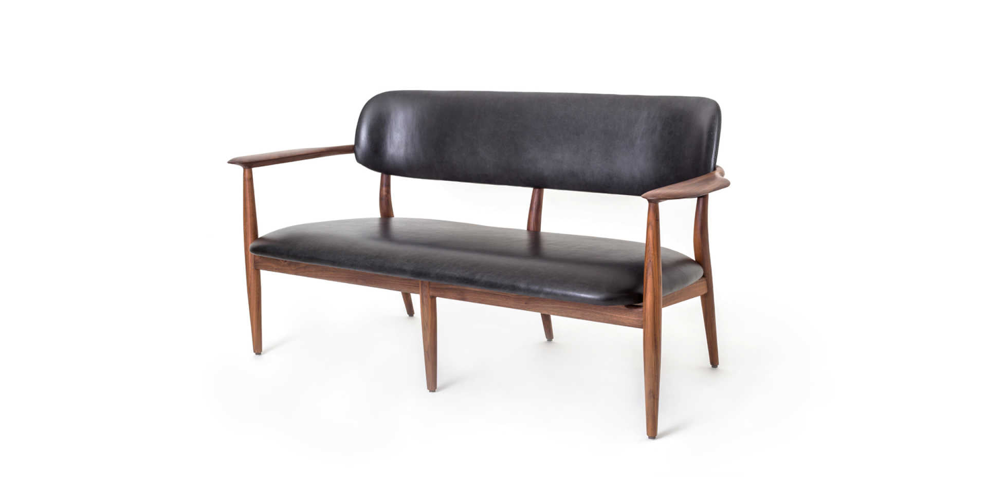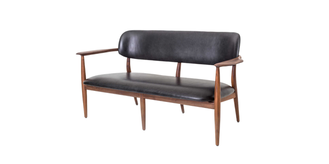 Inspired by the chair they designed for restaurant 108 in Copenhagen, the collection consists of a beautifully upholstered wooden furniture that explores the beauty of narrow silhouettes. All items feature narrow legs that elevate and support, striking a perfect balance between mid-century Danish and classic Japanese design. The collection is a tribute to heritage and craft, embodied in a timeless, flowing design, while remaining modern and comfortable. The collection stands for quality craftsmanship and materials. Furniture items are crafted from quality walnut and ash and seating features thick leather to maximise comfort. Decoration is kept to a minimum to enhance that sense of detail and shape.
